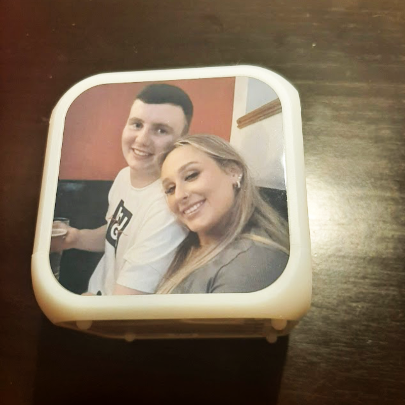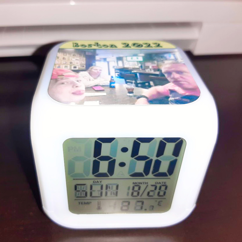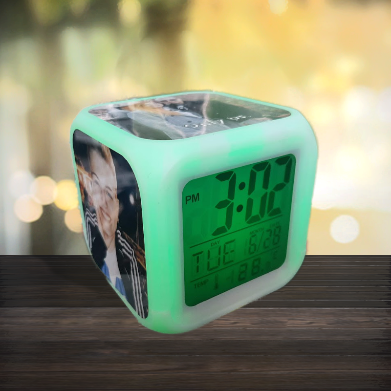 Personalise your space with this cube-shaped personalised digital alarm clock, perfect for displaying up to 3 of your favourite photos. It features a large LED panel on the front. The clock illuminates and cycles through 7 vibrant colours for a striking display.