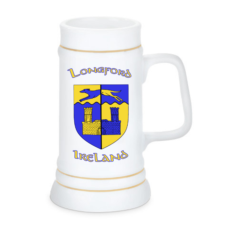 Celebrate Longford with this high-quality ceramic Souvenir Beer Mug, designed for both style and durability. This 700ml German-style stein features elegant gold rims on the top and bottom, adding a touch of refinement. With a large, sturdy handle for comfortable grip, this mug is crafted for everyday use and special occasions alike. Measuring approximately 180mm in height and 84mm in diameter, it’s the perfect size for enjoying your favourite brew.