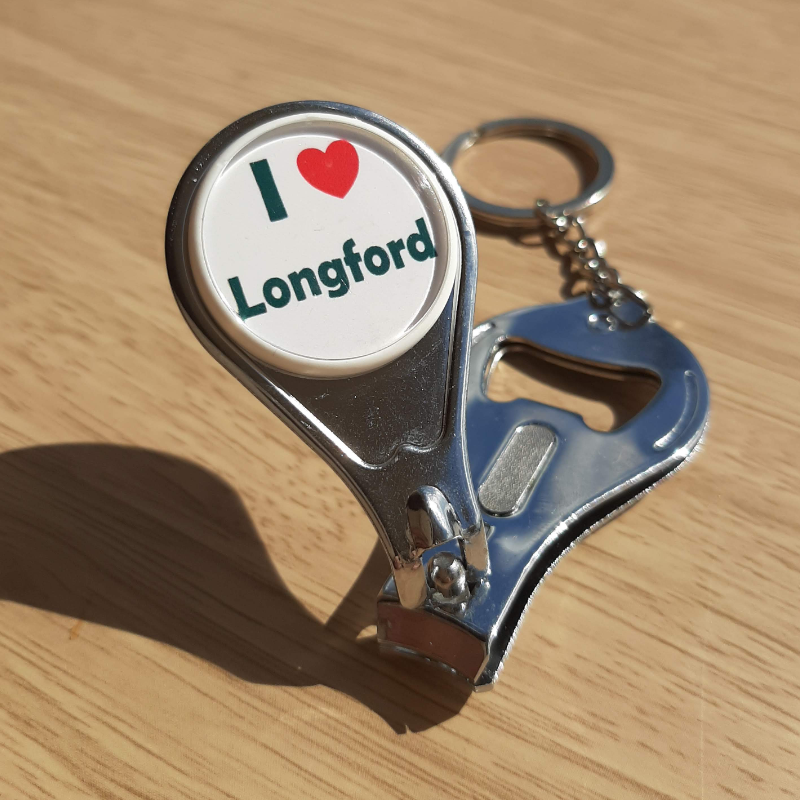 A lovely souvenir from Longford town. This useful metal keyring comprises four functions. It is a keyring with three other functions which are: nail clippers, bottle opener and a nail file. The superior quality split ring is connected to the keyring by a short metal chain.