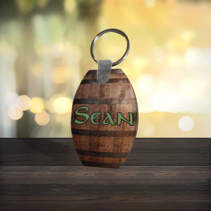 An MDF keyring fob in the shape of a beer barrel. The fob can be personalised with either an image or text. It is connected to a metal keyring by a plastic connector.