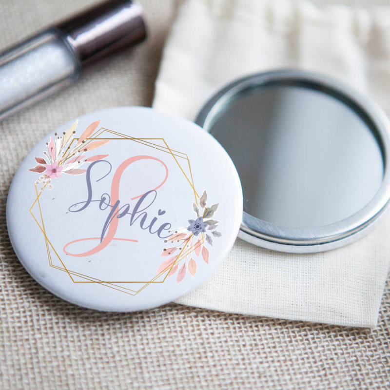This compact sized robust round mirror has a metal rear outer shell that is based on our 56mm badge. The rear can be personalised with your unique design, photo, text, initials, or you can have your favouriteย music band, sports team, pet etc.