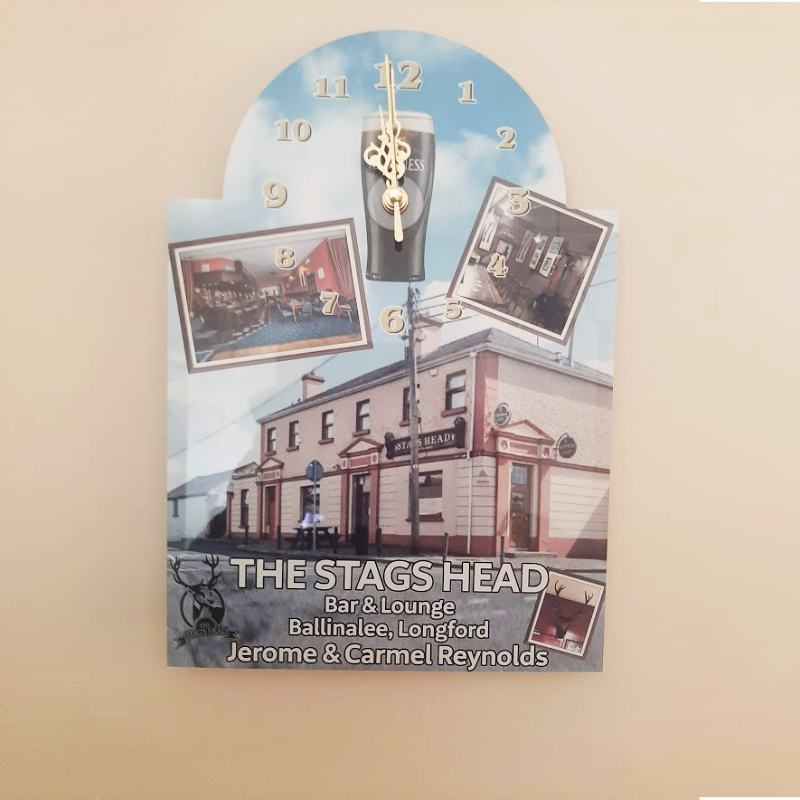 Personalised bar sign metal wall clock in white or silver brushed colour.