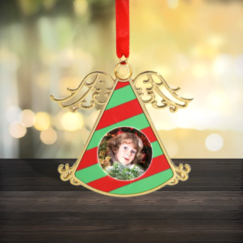 Decorate your tree this year with our beautiful hanging angel shape tree ornament. The ornament is made of aluminium and accepts 2 photographs, 1 on each side. Alternatively you could have a short sentiment on one or both sides. A fabulous way to attract attention to your festive tree. The ornament comes with a red ribbon to attach it to the tree.