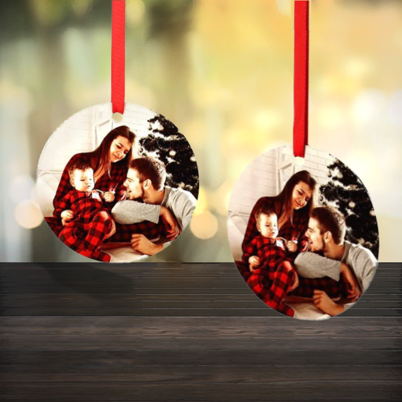 Decorate your tree this year with our beautiful hanging round shape tree ornament. The ornament is made of MDF and accepts 2 photographs, 1 on each side. Alternatively you could have a short sentiment on one or both sides. A fabulous way to attract attention to your festive tree. The ornament comes with a red ribbon to attach it to the tree.