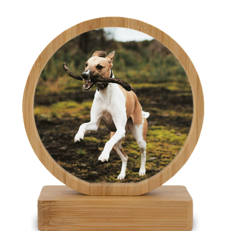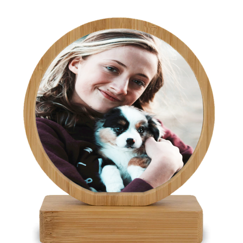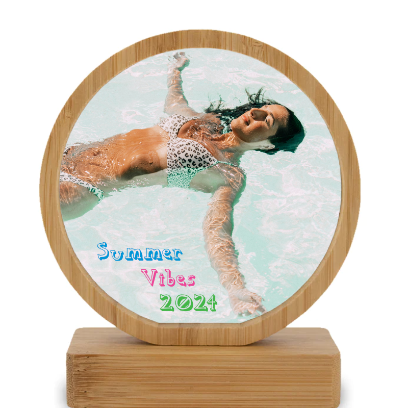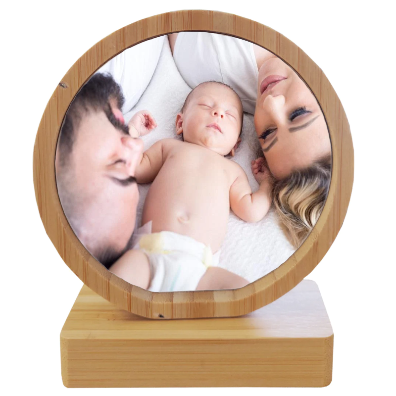 This incredible photo frame is made from eco-friendly bamboo and comes in two parts. The top part is circular and can be printed on both sides, allowing for 2 different images. The top is connected to the base by means of a magnet, which allows the top to be rotated so you can alternate your favourite pictures on display. The inserts on which the pictures are printed are made from MDF.