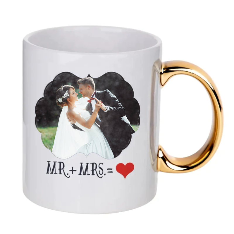 An attractive personalised mug that has a stylish and elegant polished gold coloured handle. This mug will grace any table and is certain to be a topic of conversation. It’s uses will include such occasions as wedding present gift, engagement gift, birthday gift, anniversary gift etc. It comes complete with an individual cardboard gift box.