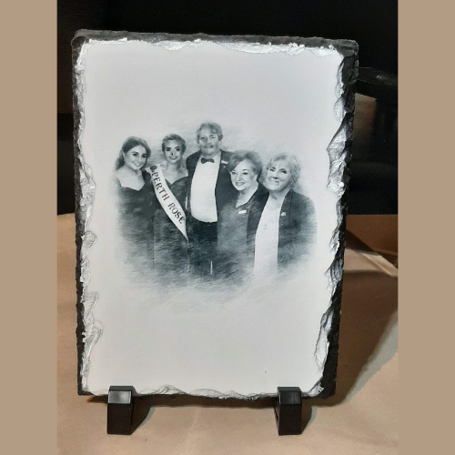 A natural stone slate with a matt finish. Ideal for displaying photographic memories or as a remembrance plaque. With naturally undulated decorative edges, this beautiful slate comes with 2 plastic stands, allowing you to display your photograph prominently.