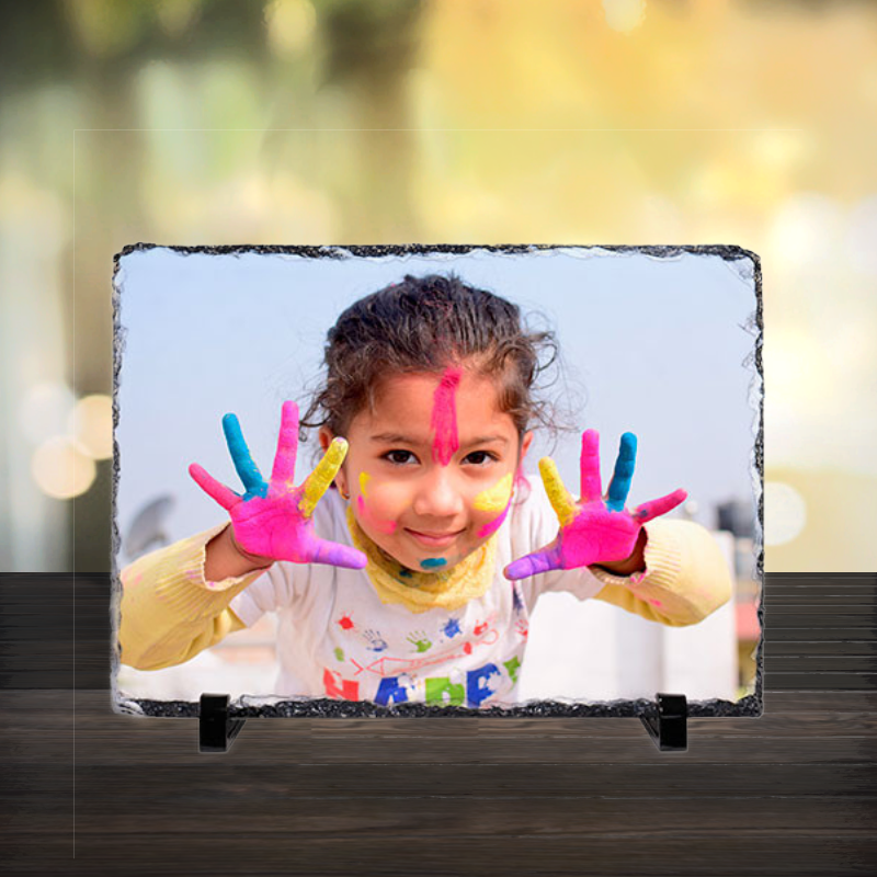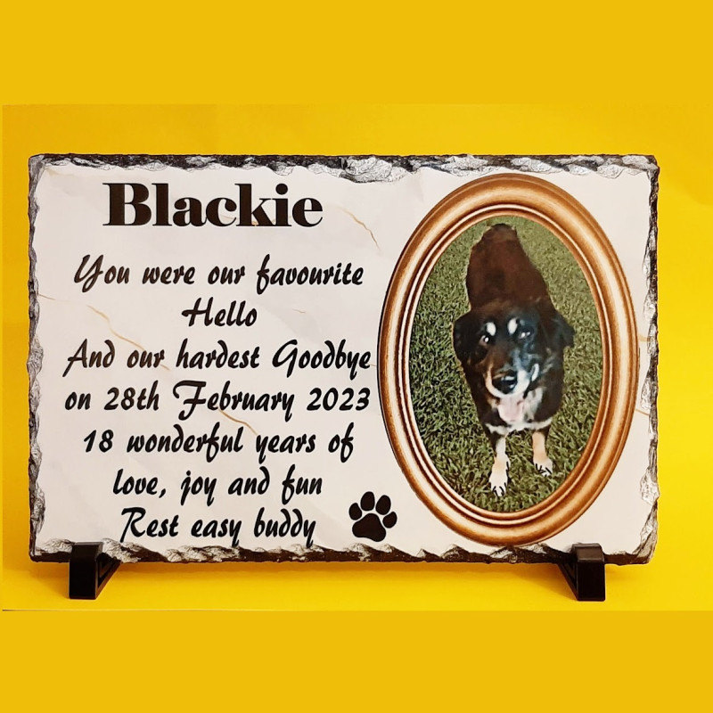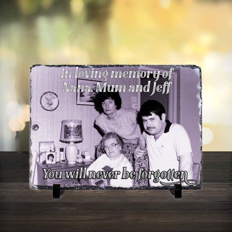 A natural stone slate with a high gloss finish. Ideal for displaying photographic memories or as a remembrance plaque. With naturally undulated decorative edges, this beautiful slate comes with 2 plastic stands, allowing you to display your photograph prominently.