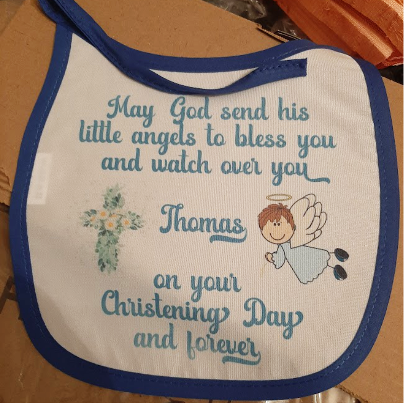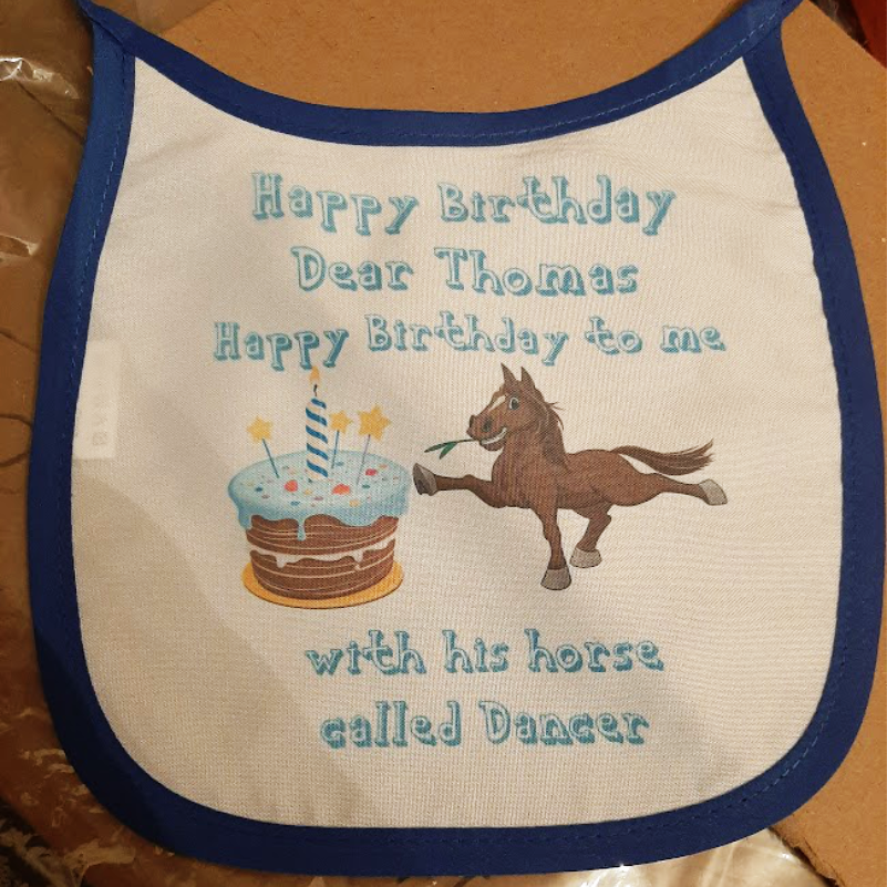This cute baby bib is 100% polyester which makes this item very easy to clean. It can be designed in various ways to suit your unique circumstances. You may want a humorous slogan, or the babyโs name, or birth date details, or a special bib for birthday, Christmas, ย childrenโs TV characters or shows etc.A great way to draw attention to your child and a great gift to give to someones newborn baby as a unique present.