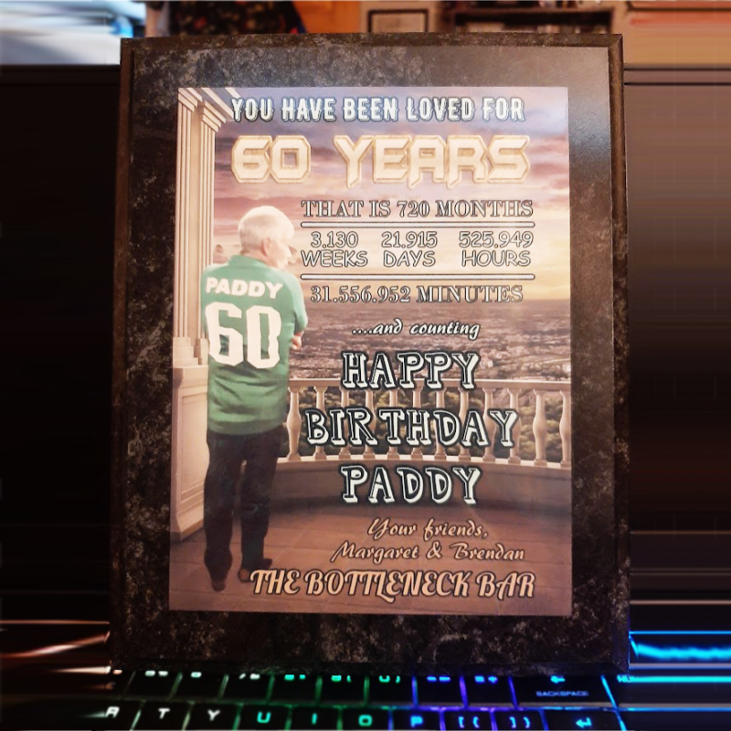 This impressive wooden plaque will look outstanding on any wall. The finish of the plaque is black marble effect and on the rear there are 2 pre-drilled grooves that enable the plaque to be hung in either portrait or landscape orientation.