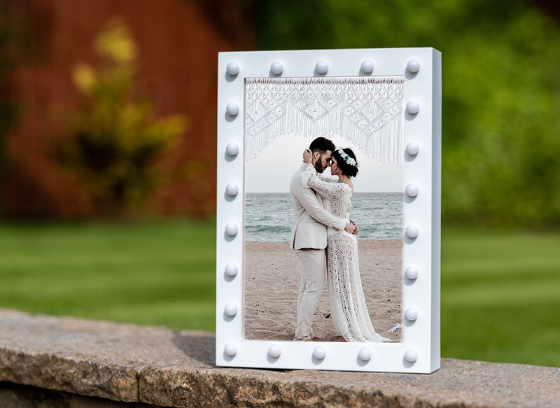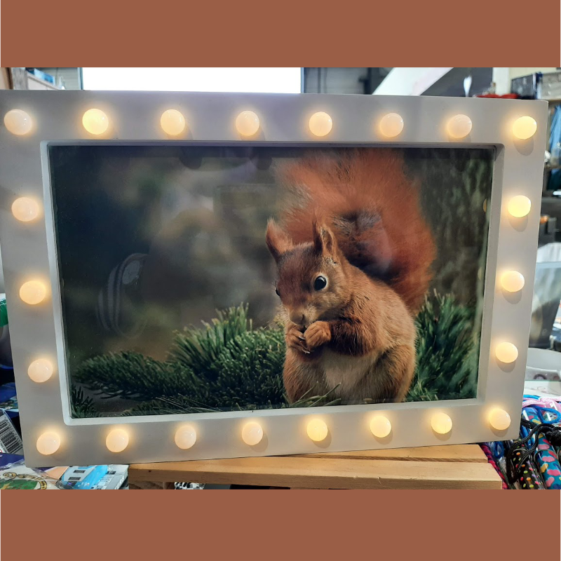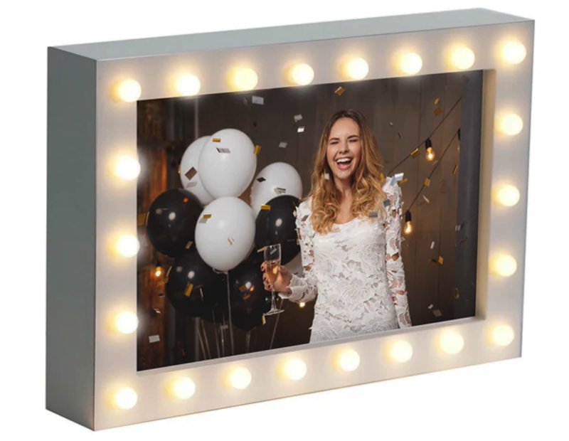 This quality made light up photo box is just the thing to draw attention to a photograph or design in the home or workplace.ย With it’s generous 237 x 147mm display size you will see plenty of detail in your image. The box is made of wood and your photo/image is printed on to metal (included) and inserted into the center of the frame.ย The image is surrounded by 22 small bulbs which when lit evenly light up the image, ensuring it attracts attention in both day light and lower light conditions. The box can be stood or hung, either vertically or horizontally. Two AAA batteries are required (not included). Extra inserts are available should you wish to change the picture in future.