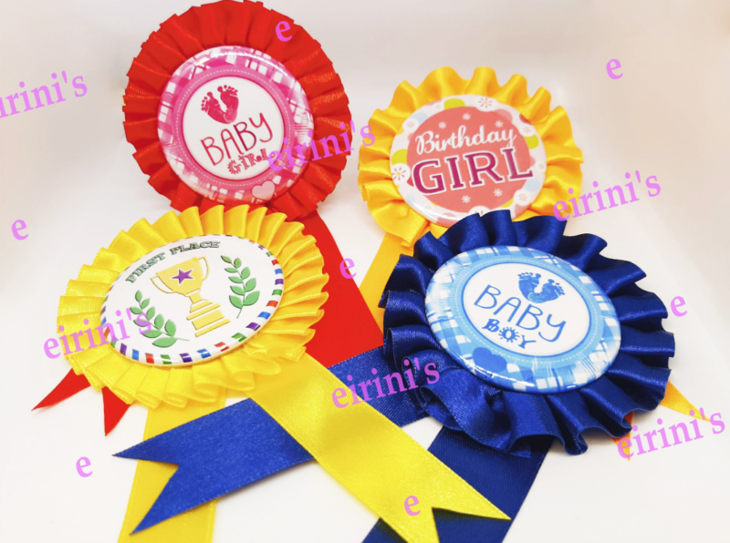 An award ribbon badge that will look great at any celebration, bridal, birthdays, talent shows, recognition awards. These rosettes are not available separately but can be purchased as an extra to our button pin badges. Please note that they will only fit the 56mm badge. They are available in 9 colours: Blue, black, red, yellow, orange, green, pink, baby blue, white.