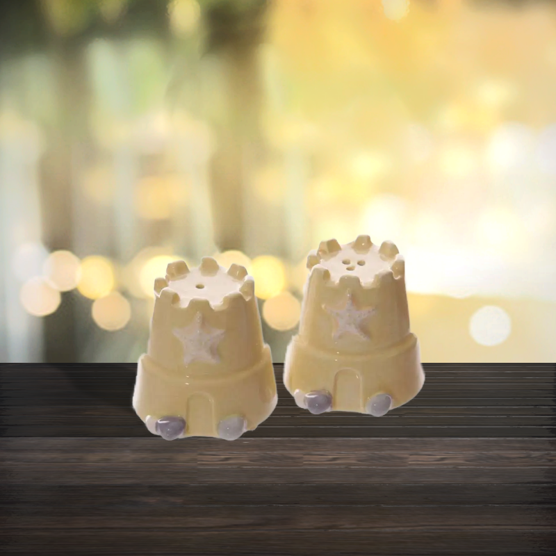 These retro style ceramic salt and pepper shakers come in a box. They will brighten a dinner table, give a summer sensation and adds a bit of the beach to any tabletop. They bring memories of childhood where we used to build castles in the sand. They look as ornaments yet they are functional.