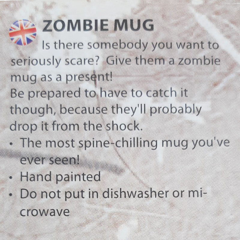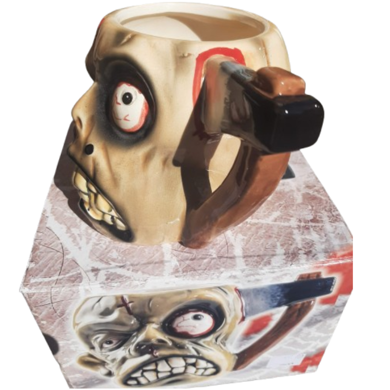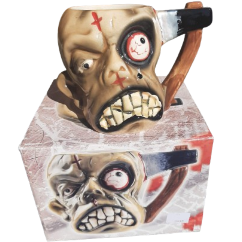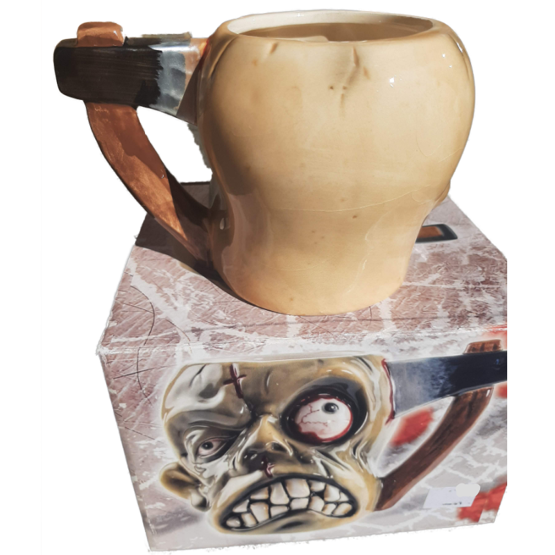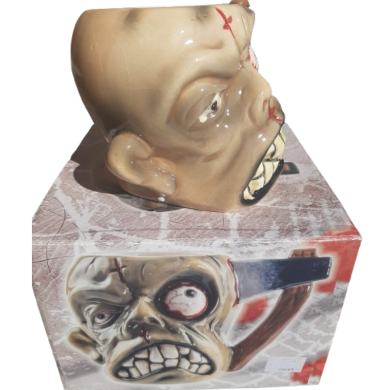 The zombie mug is completely handmade and has a very scary look. On this scary mug you can see the face of a Zombie with an axe through his head as a handle. It is a mug that will make you stand out, but you can also be sure that no one will take it away from you to pour his or her coffee. Can also be used as decorative item or collectible for those who enjoy Halloween-themed decor.